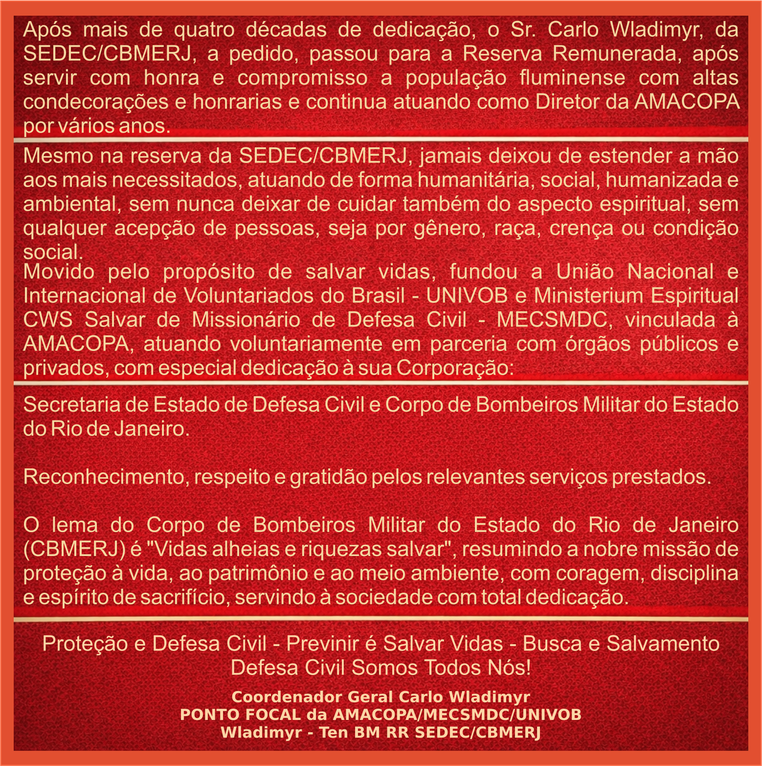A 1ª Capelania Social e Defesa Civil do Ministerium Espiritual CWS Salvar de Missionário de Defesa Civil – MECSMDC/AMACOPA, com Carta Patente reconhecida, e a Brigada Humanitária Ambiental Social Cultural do Brasil – BHASCB/AIVM, exercem de fato e de direito atividades alinhadas aos Objetivos de Desenvolvimento Sustentável (ODS) e às ações humanitárias das Nações Unidas.